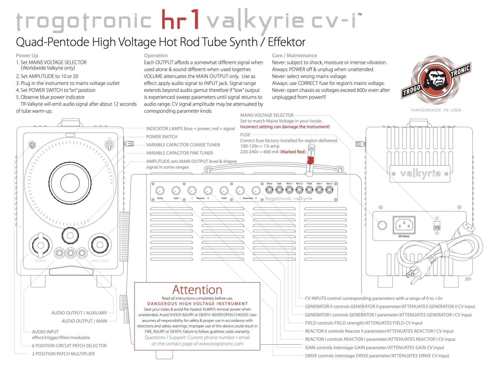 Death from above with a high voltage shriek: TR-Valkyrie marks, destroys, and parties upon arrival in the great beyond mountain lodge of Valhalla; Odin forbid you should drop her on your foot. Weighing in at a scale tipping mass that is now stereotypical of Brünhilde’s soprano role, the chassis was originally factory built by the inventors of the first production Wein-bridge oscillator. Her heaven-sent innards wrought of 4 pentode tubes completely rewired to suit the alchemy of a Trogotronic Custom. TR-Valkyrie performs demi-deity grade feats of analog audio generation or treatment to whatever you choose to run through this metal mother of all flying ladies adorned in helmets horned. When these original units were state of the art test equipment no expense was spared in their construction; these were the very best that money could buy and could not be had for less than a goodly Nordic treasure.