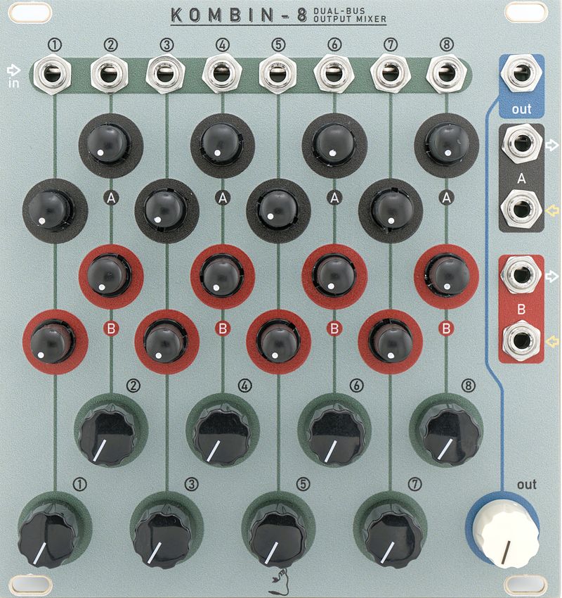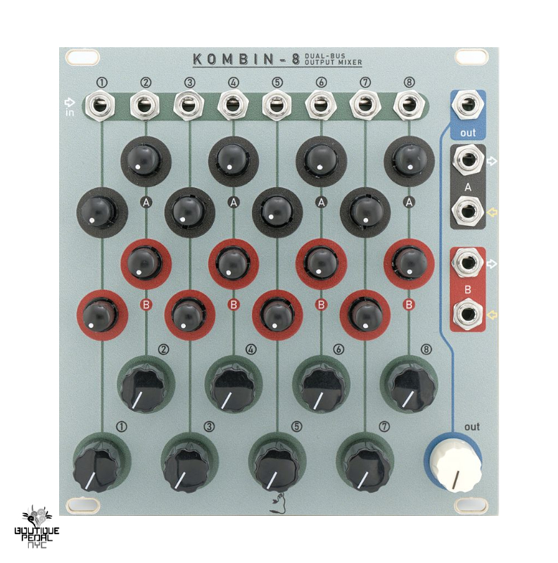 KOMBIN-8 is a compact, chainable 8-channel mono audio mixer designed for Eurorack. With two fully independent send/return buses, it’s equally at home in traditional studio-style setups or experimental signal chains. Each channel offers dedicated send controls for both buses, plus rear-panel switches to select pre- or post-fader operation for ultimate routing flexibility.