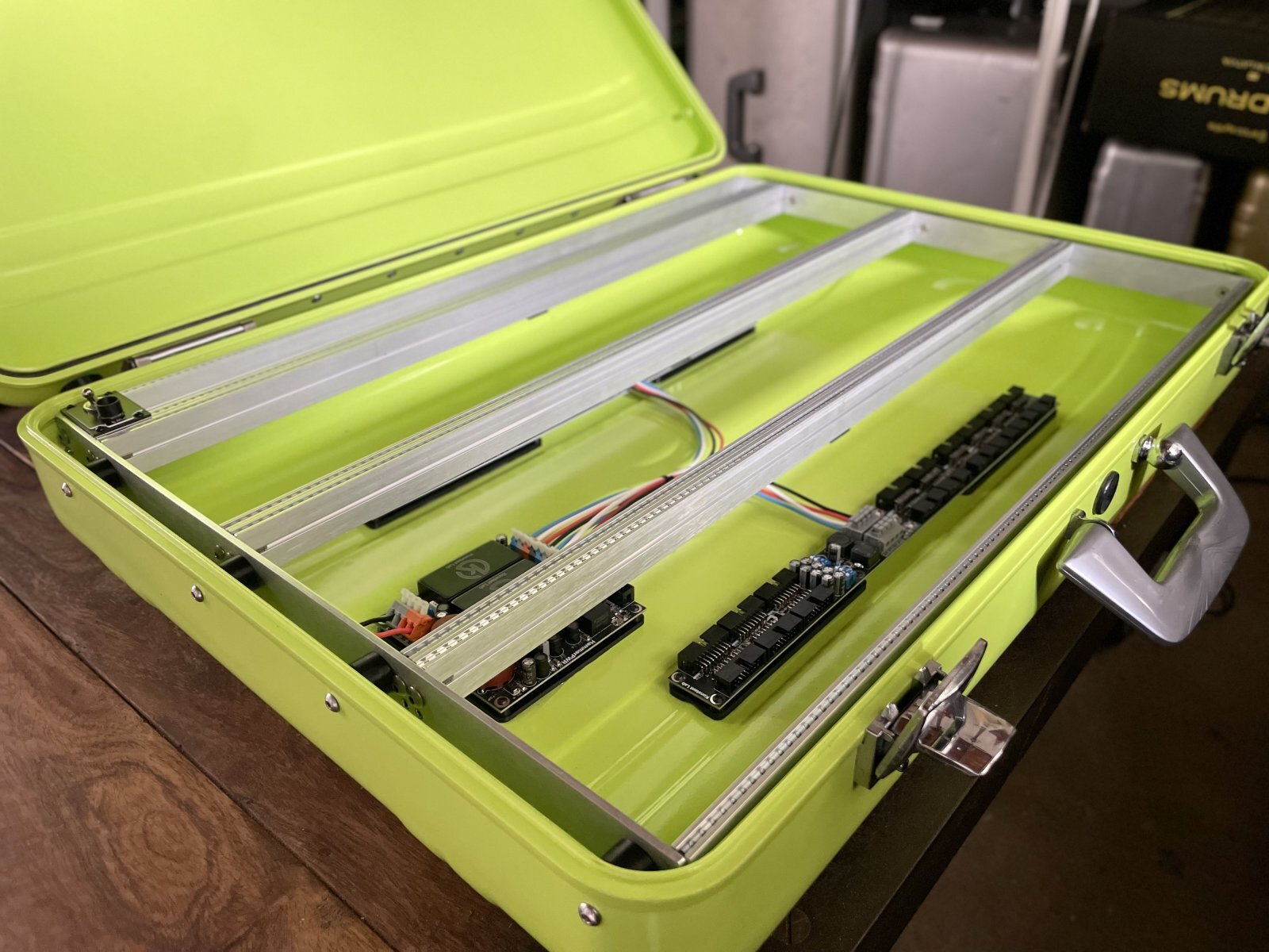 That’s when I realized that I wanted to do make one of a kind case that’s beautiful and original, also strong. Vintage Halliburton case fulfilled all my needs on that. Indeed these cases are designed to survive tough condition on all sorts of traveling and on top of that they look cool. It will protect your modules and you will stand out at the show with this space looking design. You can find pictures of Beatles traveling with this case or Apollo 11 Astronauts carry moon rocks back to earth in a Halliburton case!!!