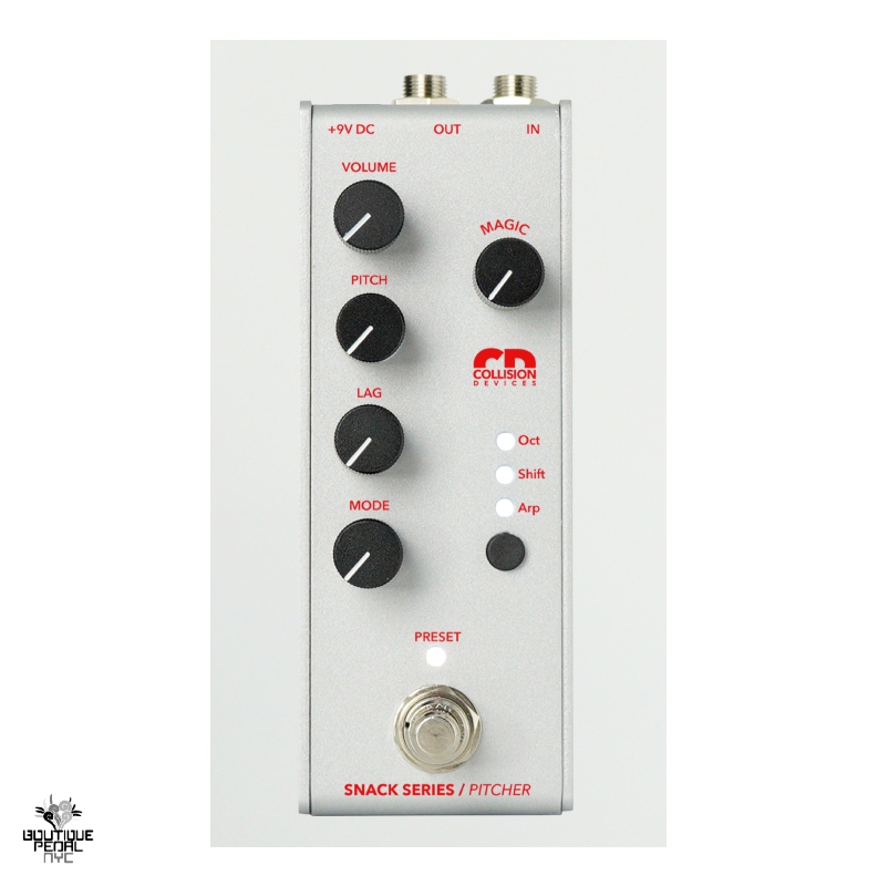 • 3 MODES : OCT - +1 /-1 Octaver with a filter and envelope control. SHIFT - Pitch shifter going from -4oct to +3oct with much more possibilites. Use its LFO or plug your expression to do whammy tricks. ARP - Pitch sequencer. Creates pattern with the pitch shifting and rate of your choice. Build your own synth.